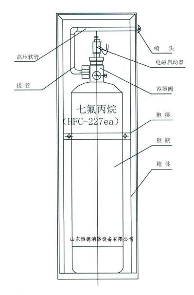 我公司生产的GQQ型七氟丙烷柜式自动灭火系统是集气体灭火、火灾探测及自动控制等于一体的箱式(柜式)自动灭火装置。它是一种不安装管网、轻便可移动、自动监控火灾、自动报警、自动灭火的现代化消防设备。符合GB16670-2006《柜式气体灭火装置性能要求和试验方法》及ISO14520-9《气体灭火系统-物理性能和系统设计》系统设计及产品标准规范的要求,本系统装置设计先进、性能可靠,极其适用于保护面积小于100m2,容积小于300m3,管网无法安装,维护困难的保护对象的火灾防护。其GQQ型七氟丙烷无管网自动灭火系统示意图参见图。