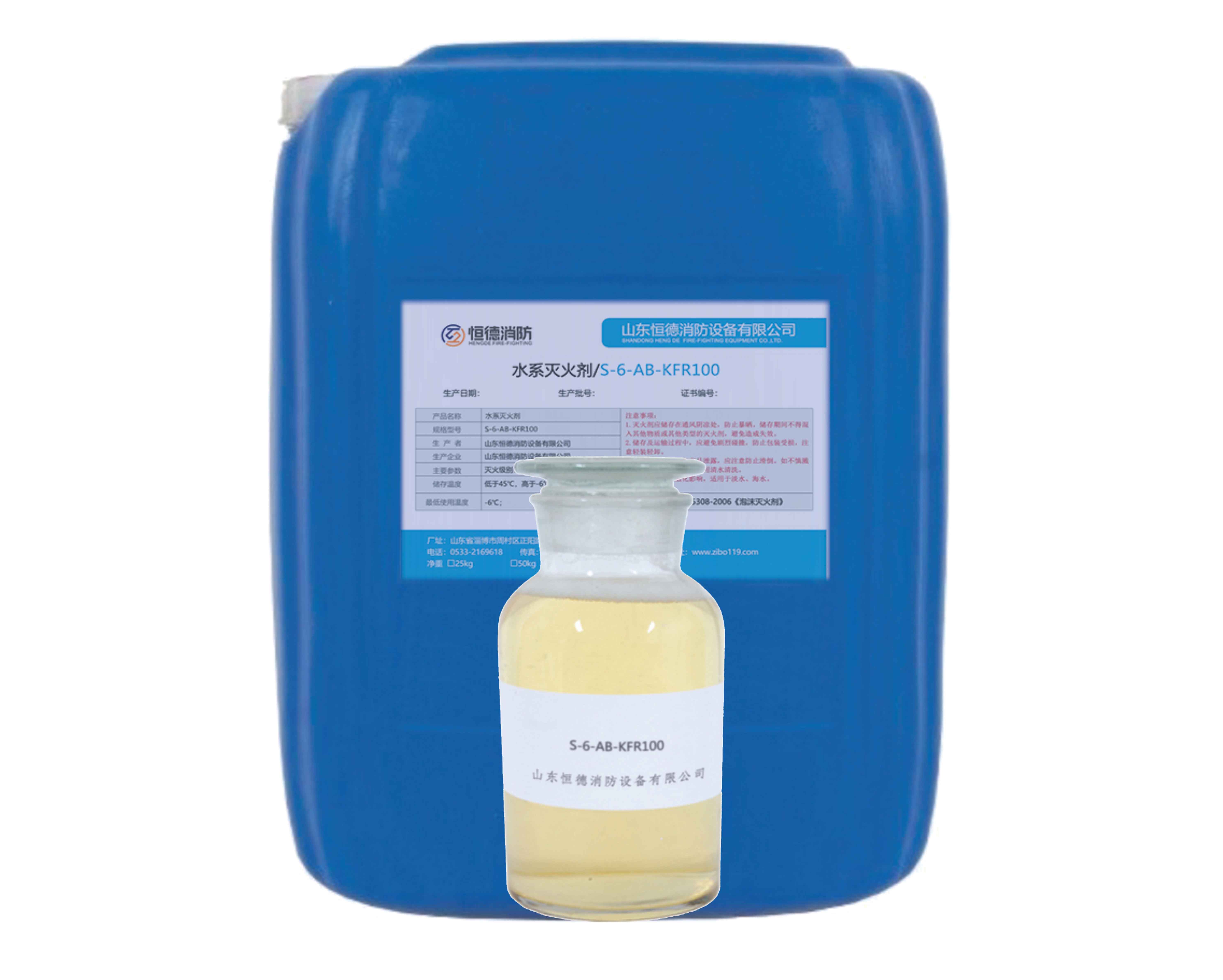 该水系灭火剂是由黄原胶、碳氢表面活性剂、氟碳表面活性剂、抗烧剂、稳定剂等组成,是新一代绿色环保型泡沫灭火剂,该灭火剂具有良好的触变性,可以在各种低倍效泡沫产生设备中与水按3:97、6:94的比例混合产生泡沫。